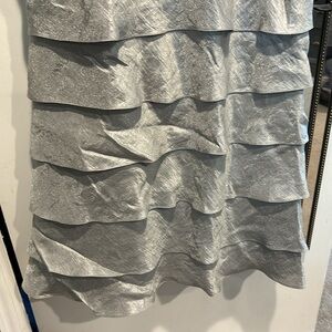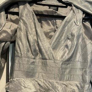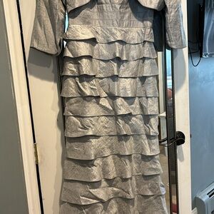 Elegant Silver Tiered Dress with Matching Bolero Jacket. This sophisticated ensemble features a shimmering silver fabric, likely with a subtle texture or metallic sheen. The dress has a flattering V-neckline and a tiered, ruffled skirt that creates beautiful movement. It comes with a coordinating bolero jacket with 3/4 length sleeves, perfect for added coverage and a polished look. Ideal for formal events, weddings, or any special occasion!