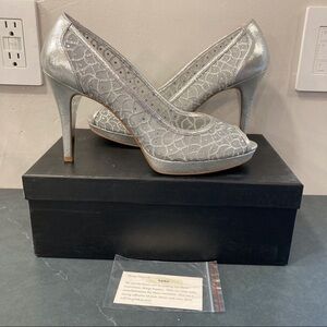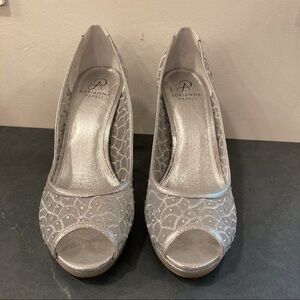 Silver mesh and rhinestone peeptoe platform heels