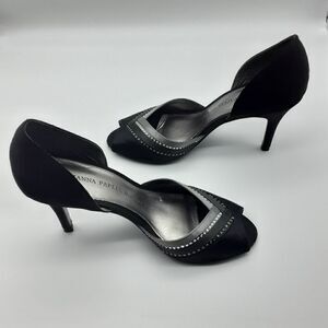 Adrianna Papell Boutigue Gambit Black Satin Heeled 2,5" Peep Open Toe Rhinestone Shoes.Leather Sole,Satin Upper.Price reduced-Small cracks on the inside of the shoes.Please see picture.Outside great pre-owned condition