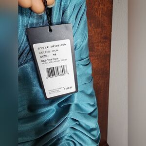 Elegant teal dress with intricate beadwork. Features ruched detailing and a keyhole neckline. Perfect for special occasions.