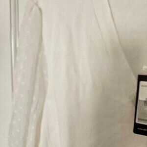 Adrianna Pappell cardigan, white sheer w/ pleated, polka dotted V-neck sleeves.