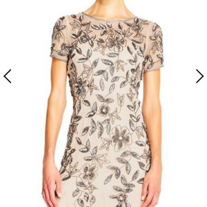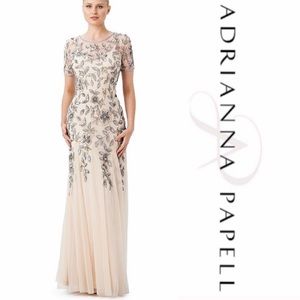 Adrianna papell Floral Beaded Godet Gown with Sheer Short Sleeves