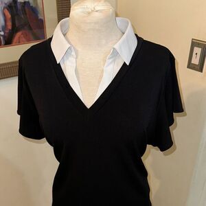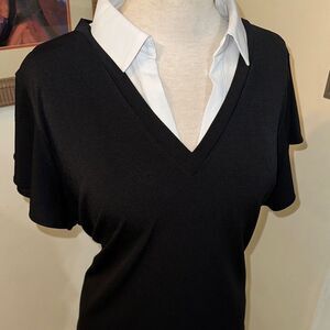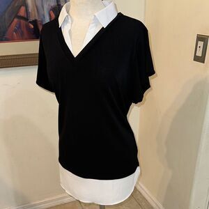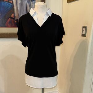 So cute! Stylish black/white V-neck top for women. It is one piece but looks like it is two. Perfect for both casual and dressy occasions. It has ruffle sleeves and a fabulous look. Excellent condition!