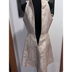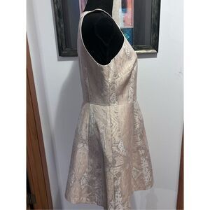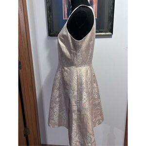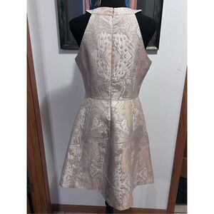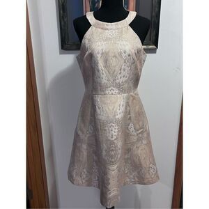 Elevate your next event look with this Adrianna Papell dress. The elegant champagne and light gold peachy tones are woven in a beautiful metallic jacquard pattern. The sleeveless design features a sophisticated halter neckline, back zip and hook & eye closure along with a classic fit-and-flare silhouette that's both flattering and timeless. Fully lined for comfort, this dress is perfect for a wedding, cocktail party, prom dress, or any formal occasion. US size 8.