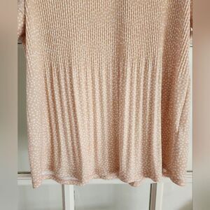 This elegant pink blouse features a delicate ruffle neckline and short sleeves, perfect for any occasion. The soft fabric and subtle ribbing and polka dot design make it a versatile addition to your wardrobe.