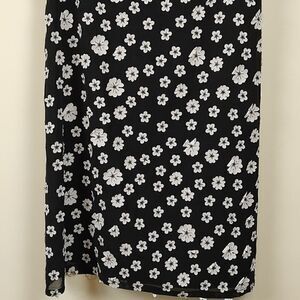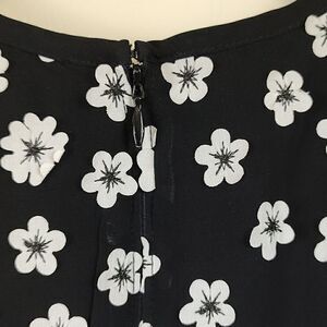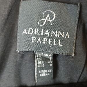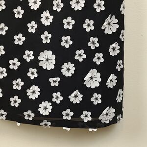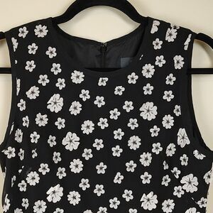 Adrianna Papell Black Floral Overlay Dress in Black and White. This sleeveless shift dress features a round neck, hidden zipper in the back with a hook and eye closure, dainty 3D applique white applied flowers, and is fully lined. Perfect dress to wear to a wedding, cocktail party, girls night, date night, wedding or baby shower, etc. 100% polyester in a size 4.