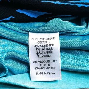 Black and white splatter-striped sheath dress with a striking cerulean and turquoise color block hem. Pullover, 100% poly, 3/4 sleeves.