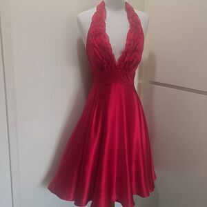 Adrianna Papell Vtg. Y2K Red Silk Babydoll Halter Dress w/Beading at Waist, Sz 6