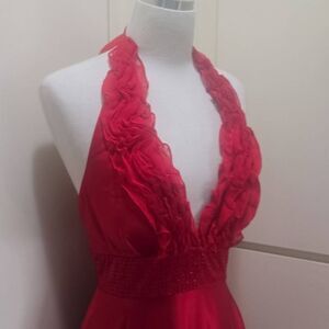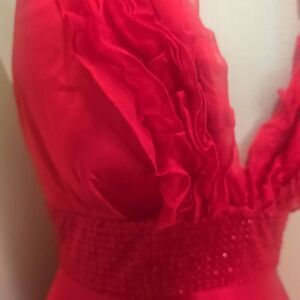 ADRIANNA PAPELL RED SILK FIT & FLARE HALTER BACK PARTY DRESS WITH RED BLSEED BEADS STUDS AT WAISTLINE-LONG TIE SCARF AT THE BACK NECKLINE-BACK ZIPPER-SIZE6-LOVELY RUFFLES DOWN THE FRONT-100% SILK SHELL 100% POLYESTER LINING.