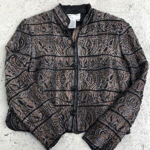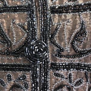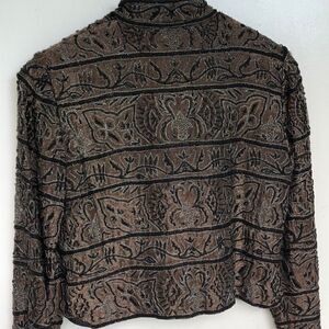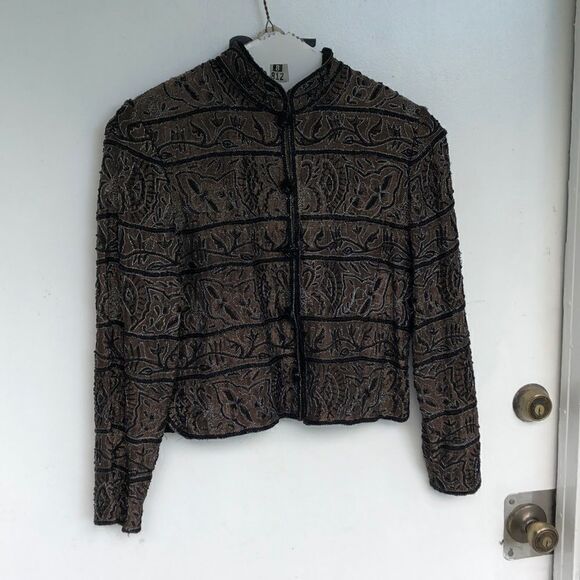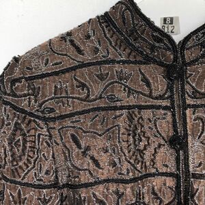 This is a beautiful bronze finish with black and silver beating jacket. The button work is exquisite. I hook closures. This is a great vintage piece to either dress it up or dress it down