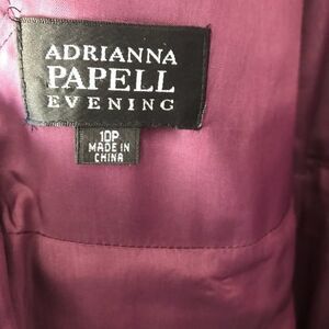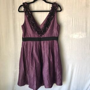 Plum color and black short evening gown. Sleeveless plunge neckline with ruffles down mid plunge back. Zip up back. Layered skirt for poof.