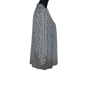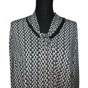Light pink and pine green multi geometric pattern tie neck knit top. 3/4 sleeve. 95% polyester/5% spandex. Size: 1X. Original price: $79.00. NWT.
