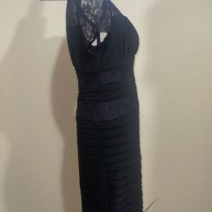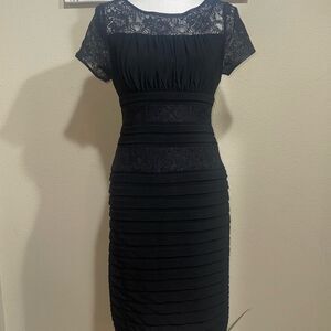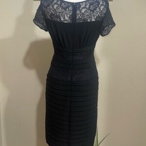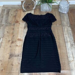 Black banded sheath w/lace details. Scooped neck,short sleeved, back zipped closure.