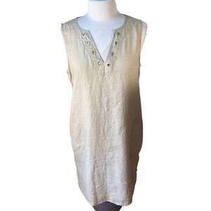 Adrianne Vittadini 100% Linen Sleeveless VNeck Pullover Shift Dress. Medium. Wheat. Decorative grommets along neckline. Vented hem, pockets! Perfect for dog days of summer. Dress up with heels or down with flipflops. Flat lay 20” P-P, 37.5” L. #beachy #modest #linen
