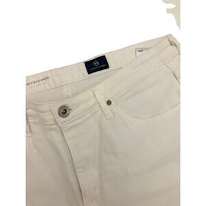 These stylish white skinny jeans by AG feature a mid-rise, cropped ankle length, raw hem, and 5-pocket styling. Skinny fit. Cotton, poly blend and gentle stretch.