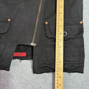 Rare Adriano Goldschmied (AG) biker vest, made in the USA. This black sleeveless utility vest features an asymmetrical zipper, metal grommet snap collar, and front flap pockets with rivet details. The frayed raw armholes add a rugged, streetwear look perfect for layering over tees or hoodies.