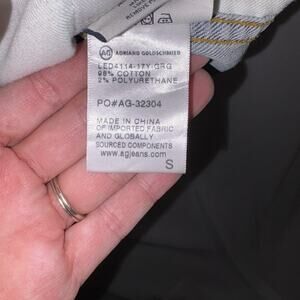 Elevate your casual style with this chic AG Adriano Goldschmied denim jacket. The jacket features a button closure, long sleeves, and multiple pockets. It is made of soft and durable cotton fabric, making it comfortable to wear and machine washable. The solid blue color and classic western style give it a timeless look that can be worn during any season. This basic jacket is perfect for any casual occasion and can be paired with any outfit to complete your look. Previously loved, but still in excellent condition.