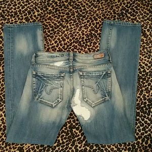 Distressed. Button and zipper front closure. Belt loops. Front and back pockets. High end quality. Your perfect pair of distressed jeans. Size is 26R. 33" inseam