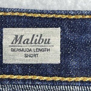 These Adriano Goldschmied Malibu Bermuda Length women's denim jean shorts in a size 25 have a waist of 26 inches and an inseam of 14 inches. The shorts are a dark wash blue color and made of a cotton blend denim stretch fabric. They are made in the USA. They have a low rise waist. See photos.