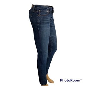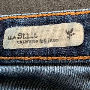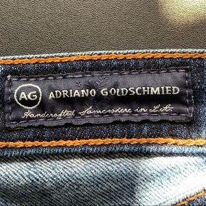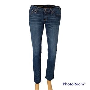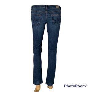 AG The Stilt Cigarette Leg Jeans/Leg opening 6.5”/29”Inseam/Waist 141/2”/ 7”Rise/16 1/2”Hip measured flat lay/Color is darker Wash blue denim. There is a small light area on upper left thigh noted in pics-and small amount of hem fraying otherwise good preowned condition
