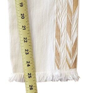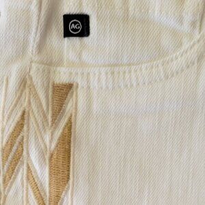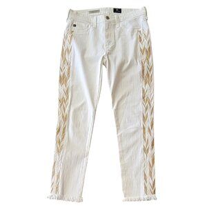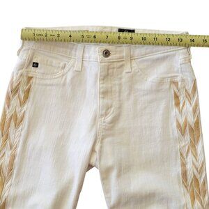 AG Adriano Goldschmied "Stilt" white denim jeans with soft golden camel colored embroidered zigzag detailing stripes down side of each leg.