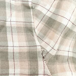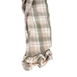 Light pink, grey, and white plaid long sleeve blouse. Ruffles around the neckline and at the end of each sleeve. There is one loose seam on the back (see picture). No other signs of wear. No holes or stains. Size: 3T.