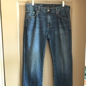 Lightly used adriano goldschmied protege men's jeans in a size 32x34. The protege is a straight leg style. The material is a 75% cotton 35% lyocell for an extra soft, relaxed fit. No signs of wear at cuffs (fraying etc)