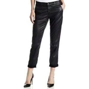 Shiny Black Low Rise Lyocell Cropped Length Tailored Trousers With Button Back Pockets