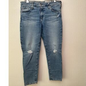 Iconic AG “The Prima Crop” in a light blue AG-ED wash. Mid-rise cigarette leg with a cropped ankle, distressed abrasions at knees, and classic five-pocket styling. Stretch denim for everyday comfort and shape retention. Zip fly with button closure; signature stitched back pockets. Great for casual outfits with tees, knits, and sneakers.