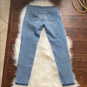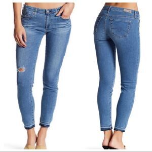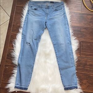 Denim distressed AG-Adriano Goldschmied The Stevie ankle, slim straight jeans. Size 28R, raw hem, factory ripped with intentional fading, and distressing throughout-please view all photos, in great pre owned condition.