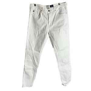 Adriano Goldschmied The Stevie Ankle Jeans in White. Size 29. Features mid-rise, zip fly with button closure, 5-pocket design, belt loops, slim straight leg, raw hem, and stretch denim. Style DSD1377LHWHT. 98% Cotton, 2% Polyurethane. Excellent pre-owned condition.