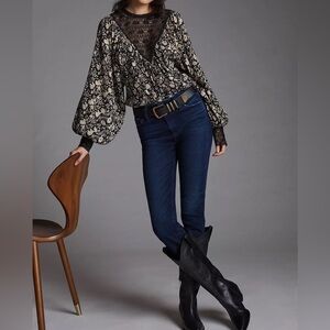 The Stevie Slim Straight jean for women features a dark wash with a faded finish. These jeans feature a mid-rise and a streamlined cut through the legs for a sleek, streamlined silhouette.