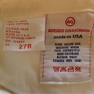 Adriano Goldschmied White The Esteem Wide Leg Denim's Size 27R. Excellent pre-owned condition. Mild bottom hem discoloration. 2 front pockets and 2 back pockets. Snap and zipper front closure. Measures approximately waist 30", inseam 33", rise 9". Cuff side to side 11".