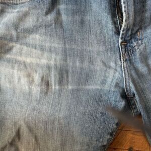 In good, used condition. Please note the hole on one leg and wear on the hems. Approximately 10 inch rise. From a pet and smoke free house.