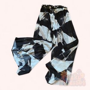Turn heads in these stunning Adrienne Landau wide-leg pants, fresh from a sample sale! Featuring an eye-catching abstract black, white, and taupe print on airy pleated fabric, these pants combine elevated artistry with effortless movement. Designed without a size tag, but fits like a modern Size 6 (please refer to measurements for accuracy). High-waisted fit with hidden side zip and flowy silhouette. NWOT and never worn. Let these pants do the talking—pair with a fitted corset top or simple bodysuit for a runway-ready look.