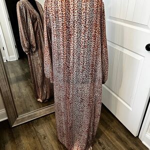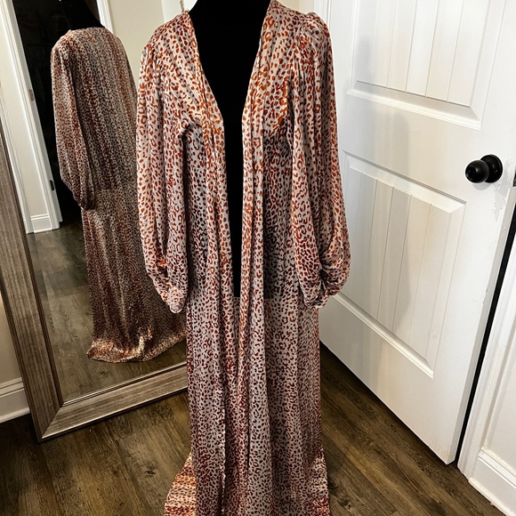 Stylish leopard print robe. Long sleeves with open front. Perfect for lounging.