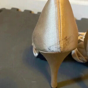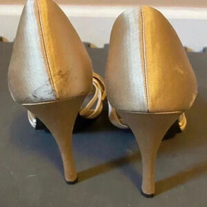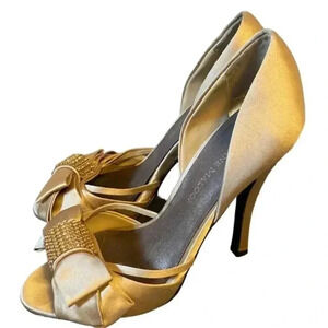Adrienne Maloof Bronze “Yalissa" Open Toe Stiletto Heels Size 7. Bow Rhinestones. These shoes are pre-owned. There is a mark on the back of one shoe. See photo. Heel Measures 4 inches high.