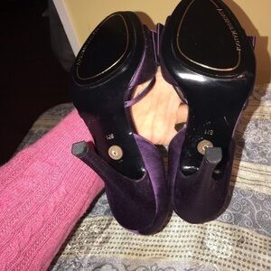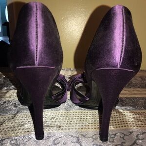 Pre-owned good condition. ADRIENNE MALOOF purpel Satin YALISSA Formal Heels Open Toe Bow with Crystal accents pumps. Formal Heels Open Toe Bow Pumps SIze 8 medium. Insole of left heel is a damaged from removing the price sticker when I bought them (see photo).