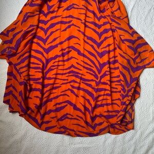 Bold orange and purple blouse. Striking animal print. Perfect for a statement look.