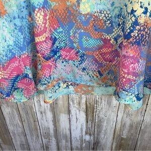 Brighten your wardrobe with this vibrant women's top. Featuring a mix of blue, pink, and orange hues, this top is perfect for any casual outing. Enjoy the comfort and style it brings to your day.