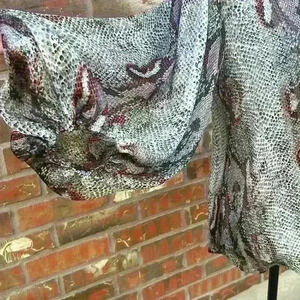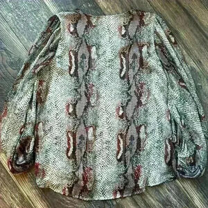 Beautiful snake print blouse in red, black, gray, white and gold. V-neck with blousy sleeves and elastic sleeve cuffs. Fully lined and beautiful. Measures 27” from top of shoulder to bottom of shirt. Measures around 20” from pit to pit.
