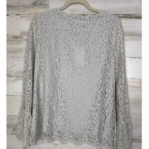 Description: pull over Light gray lace blouse with fringe detail on hemline and cuffs. Body is lined. Sleeves are not lined