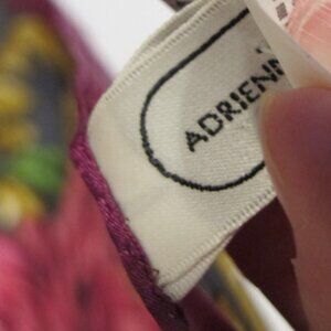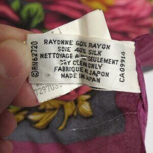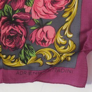 Adrienne Vitadini silk-blend purple and gray floral scarf. The edges are rich purple with pink floral pattern and gold scroll around border and in center medallion set on gray ground with tonal floral pattern. 34” square. Has been dry cleaned. A few light marks from wear on border – see photos.