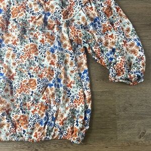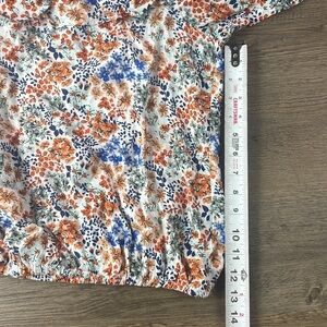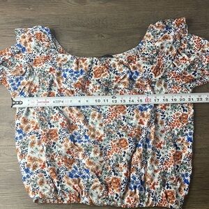Adrienne Vitadinni Women’s Off the Shoulder White Orange Blue Floral Blouse. Size large. In great used conditon. See pictures for measurements and fabric content.