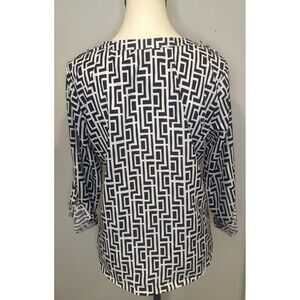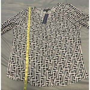 Adrienne Vittadini BLACK WHITE Geometric Blouse Roll Tab Sleeve Buttons Sz S NWT