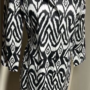 Chic blouse with striking geometric patterns. Features a classic black and white design. Perfect for elevating any outfit.