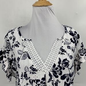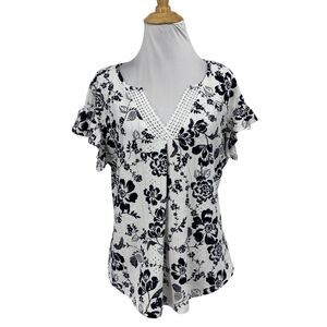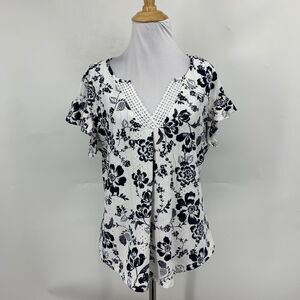 ADRIENNE VITTADINI BLOUSE WOMEN M MEDIUM FLORAL CROCHET V NECK EYELET FLUTTER