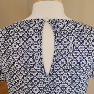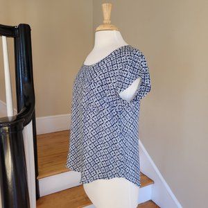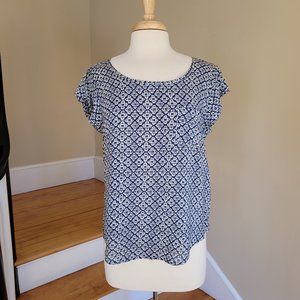 Blue Grey and white pattern. Very cool material. Great day or evening top.