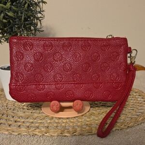 Chic red wristlet with embossed design. Perfect for any occasion. Stylish and versatile.