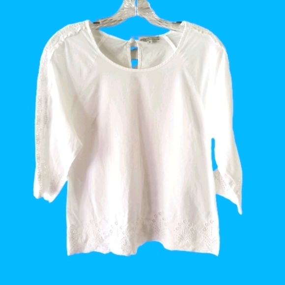 Adrienne Vittadini White top with eyelet detail along the bottom edge and sleeve. in excellent used condition. chest measures 18" across, length 23". 100% cotton